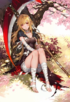 (best quality), ((masterpiece)), (highres), illustration, original, extremely detailed,yyy, 1girl, solo, blonde hair, long hair, bandages, scythe, red eyes, looking at viewer, sitting, breasts, barefoot, weapon, tree, holding, blush, bandaged leg, cherry blossoms