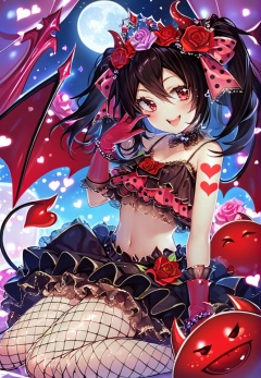 (best quality), ((masterpiece)), (highres), illustration, original, extremely detailed,yyy, 1girl, yazawa nico, solo, fishnets, flower, red eyes, rose, red flower, skirt, navel, gloves, hair ornament, smile, demon tail, black hair, bow, heart, polka dot bow, twintails, tail, hair flower, red rose, hair bow, horns, jewelry, open mouth, purple flower, midriff, polka dot, wings, purple rose, frills, hair between eyes, bracelet, tattoo, bangs, sitting, demon wings, tiara, beads, looking at viewer, suspenders, long hair, crop top, moon, suspender skirt, frilled skirt, bare shoulders, full moon, breasts, pantyhose, small breasts, blush, demon horns, pink rose, black skirt, pink flower, teeth, heart tattoo, choker, red bow, red gloves, pink bow, lace trim, balloon, weapon, bead bracelet, wariza