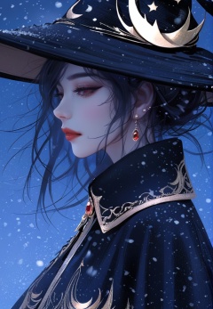 (best quality), ((masterpiece)), (highres), illustration, original, extremely detailed, 1girl, solo, hat, jewelry, mole under mouth, mole, earrings, witch hat, black hair, crescent, snowing, black headwear, red eyes, from side, hat ornament, profile, witch, long hair, half-closed eyes, upper body, eyelashes, lips, blue background, snow, red lips