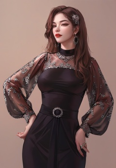 (best quality), ((masterpiece)), (highres), illustration, original, extremely detailed,lll, 1girl, solo, jewelry, earrings, mole, long hair, ring, mole under eye, dress, breasts, brown hair, red lips, hand on hip, black dress, realistic, see-through, parted lips, looking at viewer, long sleeves, hair ornament <lora:ACG ART_IV:0.2>