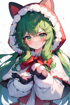 (best quality), (masterpiece),1girl, anger vein, green hair, :t, solo, gloves, closed mouth, blush, holding, green eyes, long hair, long sleeves, pout, bangs, looking at viewer, hood, white gloves, bow, star \(symbol\), very long hair, fur trim, dress, fur-trimmed hood, red bow, v-shaped eyebrows, animal hands, animal hood