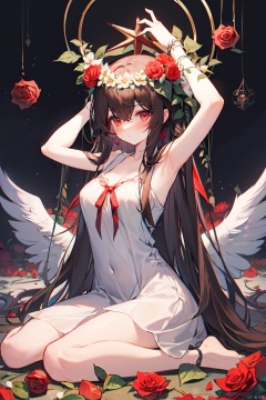 (best quality), (masterpiece),dress, solo, white dress, red eyes, halo, 1girl, flower wreath, flower, wariza, wings, sleeveless dress, long hair, sleeveless, arms up, rose, sitting, bare shoulders, red flower, head wreath, bangs, hair between eyes, blush, looking at viewer, very long hair, closed mouth, collarbone, white flower, feathered wings, brown hair, bare arms, red rose, red ribbon, breasts, barefoot,