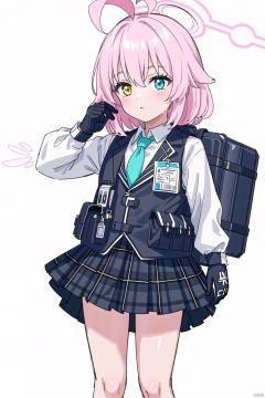 hoshinoBA, ((poakl)), short hair, bangs, blue eyes, skirt,  gloves, long sleeves, hair between eyes, yellow eyes, white shirt, pink hair, ahoge, pleated skirt, ((green necktie)), black gloves, puffy sleeves, collared shirt, fingerless gloves, black skirt, (black vest), orange eyes, plaid, heterochromia, halo, plaid skirt,puffy long sleeves, blue necktie, id card, hoshino \(blue archive\),hoshinoPast,shirt under vest,fastened vest
