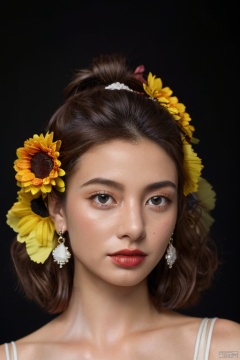 1girl,Han Chinese girls,yellow Hanfu,chinese clothes,large breasts,sunflower,jewelry, earrings,lips, makeup, portrait, eyeshadow, realistic, nose,{{best quality}}, {{masterpiece}}, {{ultra-detailed}}, {illustration}, {detailed light}, {an extremely delicate and beautiful}, a girl, {beautiful detailed eyes}, stars in the eyes, messy floating hair, colored inner hair, Starry sky adorns hair, depth of field, large breasts,cleavage,blurry, no humans, traditional media, gem, crystal, still life, Dance,movements, All the Colours of the Rainbow,zj,
