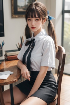 masterpiece,ultra high res,realistic,finely detail,extremely detailed,1girl,solo,skirt,chair,sitting,shirt,low twintails,long hair,looking at viewer,short sleeves,indoors,white shirt,brown hair,realistic,bangs,blurry,black skirt,ribbon,blurry background,blue ribbon,brown eyes,on chair,blunt bangs,hand on own knee,collared shirt,pencil skirt,depth of field,table,desktop,<lora:add_detail:0.5>,