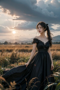 masterpiece, best quality, realistic,1girl,long hair,(twintails:1.3),red hair ribbon,solo,black dress,a gray sky,black butterfly,field,outdoors,sky,face to view,film grain,film overlay,morning glow,pastel sky,cool tones,sun rays,soft light,peaceful atmosphere,
