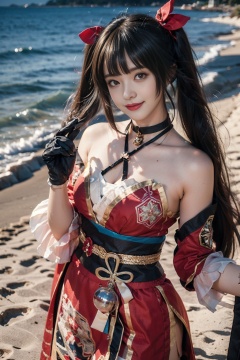 best quality, masterpiece, realistic, photorealistic, 1girl, solo, looking at viewer, smile, long black hair, bangs, standing, cowboy shot, sparkle cosplay costume, cosplay, twintails, dress, detached sleeves, bell, single glove, hair ornament, bare shoulders, fox mask, holding mask, outdoors,sunset,beach,ocean,water,blue sky