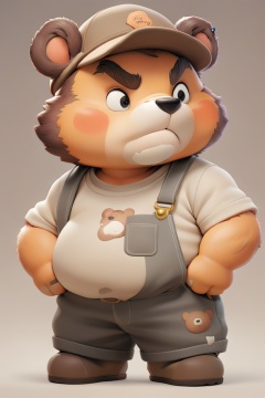 An animated bear character stands confidently, dressed in casual attire. The bear wears a beige t-shirt with the word 'Barn' written on it, gray overalls, and brown shoes. The character has a brown hat, and its facial expression is neutral., bear ears, solo, 1boy, clothes writing, male focus, shirt, standing, thick eyebrows, brown background, overalls, animal ears, brown hair, hat, gradient background, short sleeves, white shirt, fat, gradient, simple background, closed mouth, furry, full body, black eyes, brown headwear, brown fur, brown footwear, plump, denim, t-shirt, (masterpiece,best quality:1.2)
