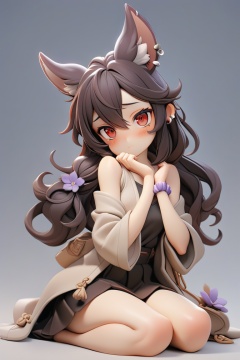 1girl, solo, long hair, looking at viewer, blush, bangs, skirt, simple background, shirt, black hair, red eyes, long sleeves, animal ears, hair between eyes, bare shoulders, sitting, closed mouth, collarbone, jacket, flower, open clothes, sleeveless, wide sleeves, black skirt, grey background, coat, head tilt, hands up, piercing, own hands together, ear piercing, purple flower, wrist scrunchie, erune, 负向提示, (masterpiece,best quality:1.2)
