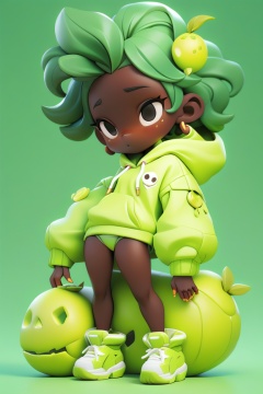 chibi,(A African black woman, green bobcut hair style) holding a green lemon,( Her decked out in an green lemon themed ensemble),complete with (green bikini and hoodie) . Her laid-back demeanor contrasts with the vibrant,spooky accessories. ((on a pure light green background)),, (masterpiece,best quality:1.2)