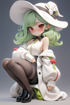 solo,1girl, bangs, bare shoulders, black footwear, black legwear,red eyes, grey background,long sleeves, looking at viewer, puffy sleeves,green hair, shoes, solo,white jacket,white witch hat,, (masterpiece,best quality:1.2)