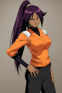 1girl,breasts,brown eyes,dark-skinned female,dark skin,hand on hip,long hair,looking at viewer,orange shirt,pants,ponytail,purple hair,shihouin yoruichi,shirt,simple background,smile,solo,,