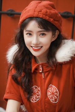 masterpiece, best quality, 1girl, red background, black hair, Long curly hair, face front, ((red fashion silk lone costume with red swirling vortexes pattern)), ((Red Plush Fur Hat)), emotional face, (close up portrait), make up, studio light, studio, ((poakl)), poakl ggll girl,laughing, Light master,yuzu