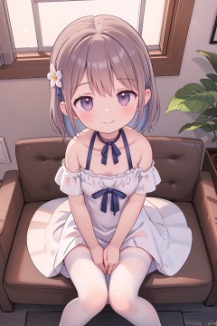 pov,from_above,1girl,loli,solo,very long white hair,gray eyes,white off-shoulder frilled dress ,white pantyhose,No shoes,purple ribbon,smile,indoors,Loft Bedroom Under Circular Window,sitting ,yokozuwari,huge ahoge,conservatory,frilled neck ring,collarbone,two_side_up,body blush,blush,pale_skin,super detailed skin,eyeliner,eyelashes,swept_bangs,hair ornament,leaf,Lush flowers,tassel,loose dress,reflection,ray tracing,chiaroscuro, Brilliant Colorful Paintings, loli, udon