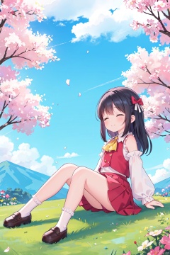 long hair, smile, skirt, shirt, black hair, long sleeves, bow, ribbon, 1girl, bare shoulders, sitting, closed mouth, full body, closed eyes, flower, hair bow, sidelocks, outdoors, frills, detached sleeves, sky,no shoes, day, socks, cloud, wide sleeves, medium hair, vest, red bow, blue sky, petals, ascot, red skirt, brown footwear, hair tubes, cloudy sky, frilled skirt, loafers, red shirt, ribbon trim, skirt set, nature, scenery, pink flower, flying, ribbon-trimmed sleeves, blue flower, white sleeves, ofuda, mountain, yellow flower, purple flower, yellow ascot, red vest, gohei, torii, field, wide shot, frilled bow, flower field, mountainous horizon, shide, frilled hair tubes, loli, udon