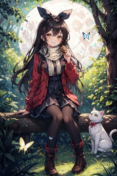1girl, cat, solo, long hair, pantyhose, scarf, black hair, butterfly, sitting, nature, bug, argyle, night, forest, tree, moon, breath, smile, yellow eyes, hair bow, boots, bow, dress, full moon, brown eyes, black pantyhose, argyle legwear, hair ribbon, ribbon,half closed Eyes, backlight, msn, colors