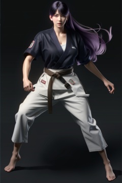 ((HRD, HUD, 8K)),((masterpiece, best quality)), highly detailed,1girl, dougi, martial arts belt, solo, bandages, long hair, purple hair, belt, full body, barefoot, fighting stance, ankle wrap, lips, black belt, bandaged arm, standing, black background, simple background, bandaged hand, purple eyes, looking at viewer, watermark, nose, bandaged leg, realistic, <lora:20240315-1710510343817:0.9>