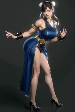 ((HRD, HUD, 8K)),((masterpiece, best quality)), highly detailed,1girl, chun-li, solo, double bun, dress, high heels, hair bun, jewelry, bracelet, brown hair, full body, spikes, black footwear, looking at viewer, breasts, brown eyes, chinese clothes, spiked bracelet, side slit, lips, china dress, short hair, sleeveless, medium breasts, bun cover, makeup, pelvic curtain, simple background, <lora:20240315-1710510343817:0.9>