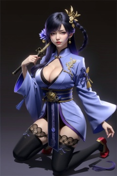 ((HRD, HUD, 8K)),((masterpiece, best quality)), highly detailed,1girl, breasts, raiden shogun, purple hair, sword, weapon, human scabbard, thighhighs, long hair, solo, japanese clothes, purple eyes, musou isshin (genshin impact), hair ornament, large breasts, holding sword, holding weapon, kimono, holding, looking at viewer, kneeling, cleavage, sash, braid, bangs, obi, mole, wide sleeves, tassel, mole under eye, tomoe (symbol), mitsudomoe (shape), simple background, full body, flower, purple nails, bridal gauntlets, long sleeves, black thighhighs, ribbon, very long hair, closed mouth, obijime, electricity, <lora:20240315-1710510343817:0.9>