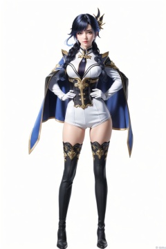 ((HRD, HUD, 8K)),((masterpiece, best quality)), highly detailed,1girl, solo, eula (genshin impact), thighhighs, gloves, hand on hip, full body, blue hair, hairband, boots, long sleeves, thigh boots, looking at viewer, breasts, standing, simple background, bangs, black gloves, necktie, cape, white background, hair ornament, black hairband, yellow eyes, vision (genshin impact), blue necktie, high-waist shorts, medium breasts, lips, medium hair, shorts, leotard, wide sleeves, closed mouth,  <lora:20240315-1710510343817:0.8>