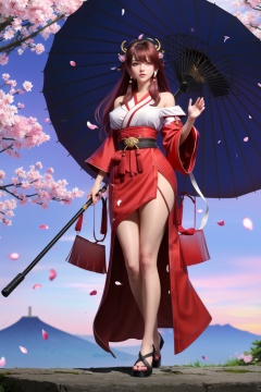 ((HRD, HUD, 8K)),((masterpiece, best quality)), highly detailed,1girl, yae miko, umbrella, long hair, solo, breasts, pink hair, low-tied long hair, petals, japanese clothes, full body, hair ornament, detached sleeves, oil-paper umbrella, bare legs, holding, purple eyes, holding umbrella, sandals, wide sleeves, looking at viewer, jewelry, large breasts, very long hair, torii, animal ears, bangs, fox ears, nontraditional miko, legs, cherry blossoms, earrings, standing, falling petals, bare shoulders, <lora:20240315-1710510343817:0.8>
