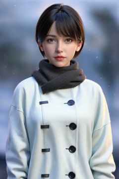 ((HRD, HUD, 8K)),((masterpiece, best quality)), highly detailed,1girl, solo, scarf, realistic, coat, black hair, looking at viewer, red scarf, lips, black eyes, short hair, winter clothes, nose, bangs, long sleeves, sweater, swept bangs, winter coa, white background, upper body, <lora:20240315-1710510343817:0.8>