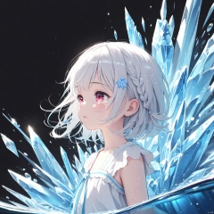 (masterpiece),(best quality),illustration,ultra detailed,hdr,Depth of field,(colorful),loli, wlop,1 girl,loli,White Dress,White short hair,braids,lily flower hair clip,upper body,cry,water,black background,Ice crystal,dappled sunlight,Suspended colorless crystal,beautiful detailed glow, (detailed ice), beautiful detailed water<lora:EMS-266888-EMS:0.200000>, <lora:EMS-288516-EMS:0.100000>, <lora:EMS-300688-EMS:0.200000>, <lora:EMS-301024-EMS:0.100000>, <lora:EMS-311400-EMS:0.400000>, <lora:EMS-312802-EMS:0.200000>
