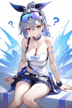 (masterpiece), (best quality), illustration, ultra detailed, hdr, Depth of field, (colorful),1girl, solo, bandaid, breasts, silver wolf (honkai: star rail), grey hair, ?, long hair, looking at viewer, grey eyes, simple background, white background, jewelry, medium breasts, collarbone, earrings, hair between eyes, cleavage, eyewear on head, goggles on head, crossed bangs, bandaid on arm, closed mouth, goggles, sitting, bare shoulders, bandaid on leg, ponytail<lora:EMS-311400-EMS:0.400000>, <lora:EMS-312802-EMS:0.200000>, <lora:EMS-266888-EMS:0.200000>, <lora:EMS-288516-EMS:0.100000>, <lora:EMS-300688-EMS:0.200000>, <lora:EMS-301024-EMS:0.100000>
