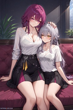 (masterpiece), (best quality), illustration, ultra detailed, hdr, Depth of field, (colorful),2girls, multiple girls, kafka (honkai: star rail), breasts, trailblazer (honkai: star rail), stelle (honkai: star rail), cleavage, purple hair, large breasts, grey hair, smile, shirt, yellow eyes, white shirt, purple eyes, sitting, long hair, skirt, collarbone, jewelry, yuri, short sleeves, black skirt, closed mouth, necklace, thighs, hand on another's head, indoors, underwear, alternate costume, patreon username, lap pillow<lora:EMS-311400-EMS:0.400000>, <lora:EMS-312802-EMS:0.200000>, <lora:EMS-266888-EMS:0.200000>, <lora:EMS-288516-EMS:0.100000>, <lora:EMS-300688-EMS:0.200000>, <lora:EMS-301024-EMS:0.100000>