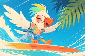 Cockatiel\(IP\), masterpiece, best qualit, surfing, bird, cloud, sky, sunglasses, palm, coconut, holding the coconut, smile, close eyes, colorful crown, beak, sea wave, surfboard,