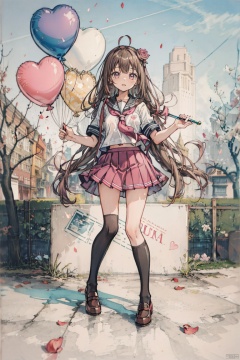 1girl, standing,balloon, brown_footwear, brown_hair, cherry_blossoms, cloud, confetti, falling_petals, heart, heart_balloon, holding, kneehighs, long_hair, petals, petals_on_liquid, pink_eyes, pink_skirt, pleated_skirt, rose_petals, school_uniform, serafuku, shirt, shoes, skirt, sky, socks, solo, wand, white_shirt, lines