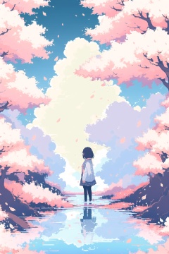 solo, tree, 1girl, cherry blossoms, cloud, reflection, sky, long sleeves, petals, wide shot, outdoors, ripples, short hair, shirt, water <lora:Pixel Art1.1:0.8>,