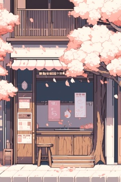 no humans, cherry blossoms, outdoors, sign, scenery, petals, tree, building, bench, door, window <lora:Pixel Art1.1:0.8>,