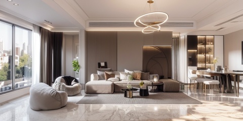 Modern low luxury style, realistic details, indoor photography, french window, white curtains, leather white sofa, gray reflective tile floor, brown carpet, glass table, metal luminous chandelier