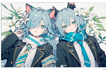 looking at viewer, smile, open mouth, bangs, blue eyes, multiple girls, shirt, hair ornament, long sleeves, 2girls, animal ears, school uniform, green eyes, blue hair, jacket, white shirt, braid, flower, grey hair, multicolored hair, lying, parted lips, green hair,  open clothes, necktie, collared shirt, virtual youtuber, hood,  on back, scarf, hair over one eye, open jacket, streaked hair, black jacket, sleeves past wrists, sleeping, hood down, white flower, letterboxed, black necktie, Line