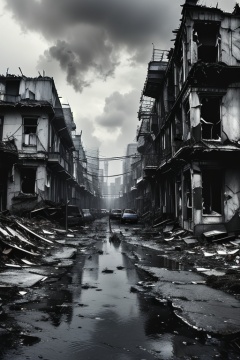 still life , High resolution movie lighting, surreal detail photography, Movie style, Doomsday, outdoors, monochrome, sky, no humans, building, cloud, greyscale, scenery, cloudy sky, streets filled with dilapidated houses, complex buildings