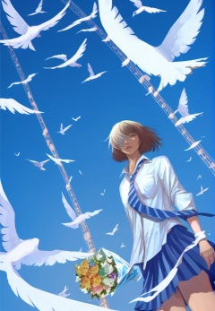 (best quality), ((masterpiece)), (highres), illustration, original, extremely detailed, <lora:少女梦绘卷:0.7>1girl, bird, shirt, skirt, solo, blue sky, blue skirt, necktie, bouquet, blue necktie, white shirt, wing collar, dove, collared shirt, flower, pleated skirt, holding bouquet, sky, day, looking at viewer, blue background, brown hair, striped, standing, holding, breast pocket, pocket, school uniform, one eye covered, brown eyes, cowboy shot, outdoors, short hair, closed mouth, striped necktie, flock, diagonal stripes