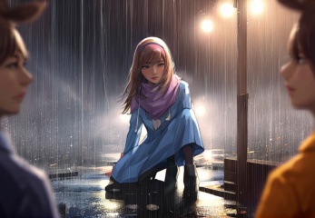(best quality), ((masterpiece)), (highres), illustration, original, extremely detailed, <lora:少女梦绘卷:0.7>1girl, rain, long hair, hairband, blurry, solo focus, scarf, brown hair, dress