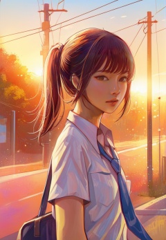 (best quality), ((masterpiece)), (highres), illustration, original, extremely detailed, <lora:少女梦绘卷:0.7>1girl, solo, shirt, wing collar, necktie, looking at viewer, power lines, utility pole, white shirt, collared shirt, outdoors, parted lips, ponytail, from side, short sleeves, upper body, brown hair, nose, brown eyes, looking to the side, breast pocket, pocket, school uniform, adjusting necktie, blue necktie, hand up, bag