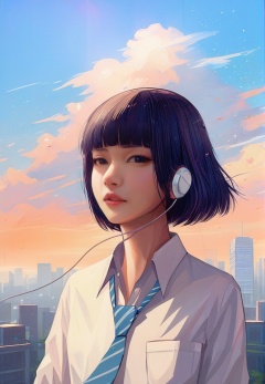 (best quality), ((masterpiece)), (highres), illustration, original, extremely detailed, <lora:少女梦绘卷:0.7>1girl, solo, shirt, necktie, earphones, parted lips, white shirt, outdoors, black hair, sky, day, nose, collared shirt, looking at viewer, short hair, blue sky, upper body, wing collar, striped, earbuds, bangs, blue necktie, pocket, lips, striped necktie, building, city, breast pocket, black eyes, cloud, school uniform, bob cut, blunt bangs