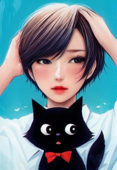 (best quality), ((masterpiece)), (highres), illustration, original, extremely detailed, <lora:少女梦绘卷:0.7>1girl, cat, short hair, black cat, black eyes, blue background, animal, blush, solo, lips, bow, bowtie, red lips, holding, upper body, red bow, hands on own head, shirt