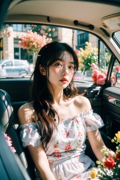 (Masterpiece, best quality: 1.2), illustration, absurdity, high-level, extremely detailed, an 18-year-old lovely girl, sitting in a car full of flowers, white long curly hair, elegant hair, powder blusher, facial focus, blue off shoulder dress, surrounded by flowers, natural posture, holiday style, depth of field, simulation film, super details, dreamy lofi photography, colorful, covered with flowers and vines, interior view, shot on fuiifilm XT4,