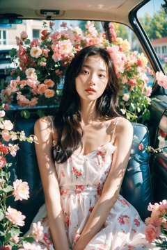 (Masterpiece, best quality: 1.2), illustration, absurdity, high-level, extremely detailed, 1 girl, sitting in the trunk full of flowers, white long curly hair, elegant hair, powder blusher, facial focus, bubble sleeve dress dress, surrounded by flowers, colorful flowers, natural posture, holiday style, depth of field, simulation film, super details, dreamlike lofi photography, colorful, covered with flowers and vines, internal view, Shooting on the fuiifilm XT4,