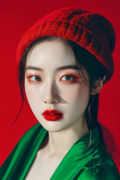 red background,hanfu,portrait,surrealistic,a woman with red lipstick and a red hat on her head and a green background with a red background,blurry,depth_of_field,1girl,blurry_foreground,solo,blurry_background,red_headwear,realistic,looking_at_viewer,lips,