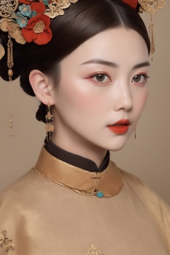 <lora:贵妃:1>,best quality,masterpiece,women of the qing dynasty in china,solid color background,beige_background,