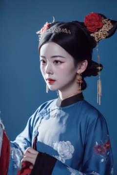 <lora:贵妃:0.8>,best quality,masterpiece,women of the qing dynasty in china,blue background,