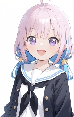 1girl,solo,long hair,looking at viewer,smile,open mouth,bangs,skirt,simple background,shirt,hair ornament,long sleeves,white background,twintails,school uniform,blue hair,purple eyes,jacket,upper body,pink hair,ahoge,white hair,:d,multicolored hair,pleated skirt,open clothes,serafuku,sailor collar,star \(symbol\),two-tone hair,black jacket,neckerchief,buttons,low twintails,white sailor collar,star hair ornament,double-breasted,black neckerchief,