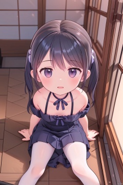 pov,from_above,1girl,loli,solo,very long black hair,gray eyes,white off-shoulder frilled dress ,white pantyhose,No shoes,purple ribbon,smile,indoors,Loft Bedroom Under Circular Window,sitting ,yokozuwari,huge ahoge,conservatory,frilled neck ring,collarbone,two_side_up,body blush,blush,pale_skin,super detailed skin,eyeliner,eyelashes,swept_bangs,hair ornament,leaf,Lush flowers,tassel,loose dress,reflection,ray tracing,chiaroscuro, Brilliant Colorful Paintings, loli, udon