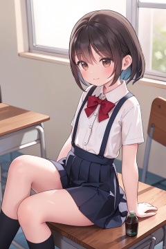 indoors, suspender skirt, thighs, classroom, window, short sleeves, leaning back, school desk, brown hair, knees up, legs,  kneehighs, on desk, school uniform, brown eyes, chair, arm support, white socks,