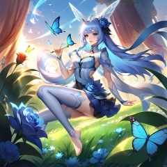 wzgongsunli_a,bug, butterfly, blue_butterfly, flower, 1girl, rose, blue_rose, blue_flower, feet, long_hair, barefoot, glowing_butterfly, thighhighs, white_butterfly, plant